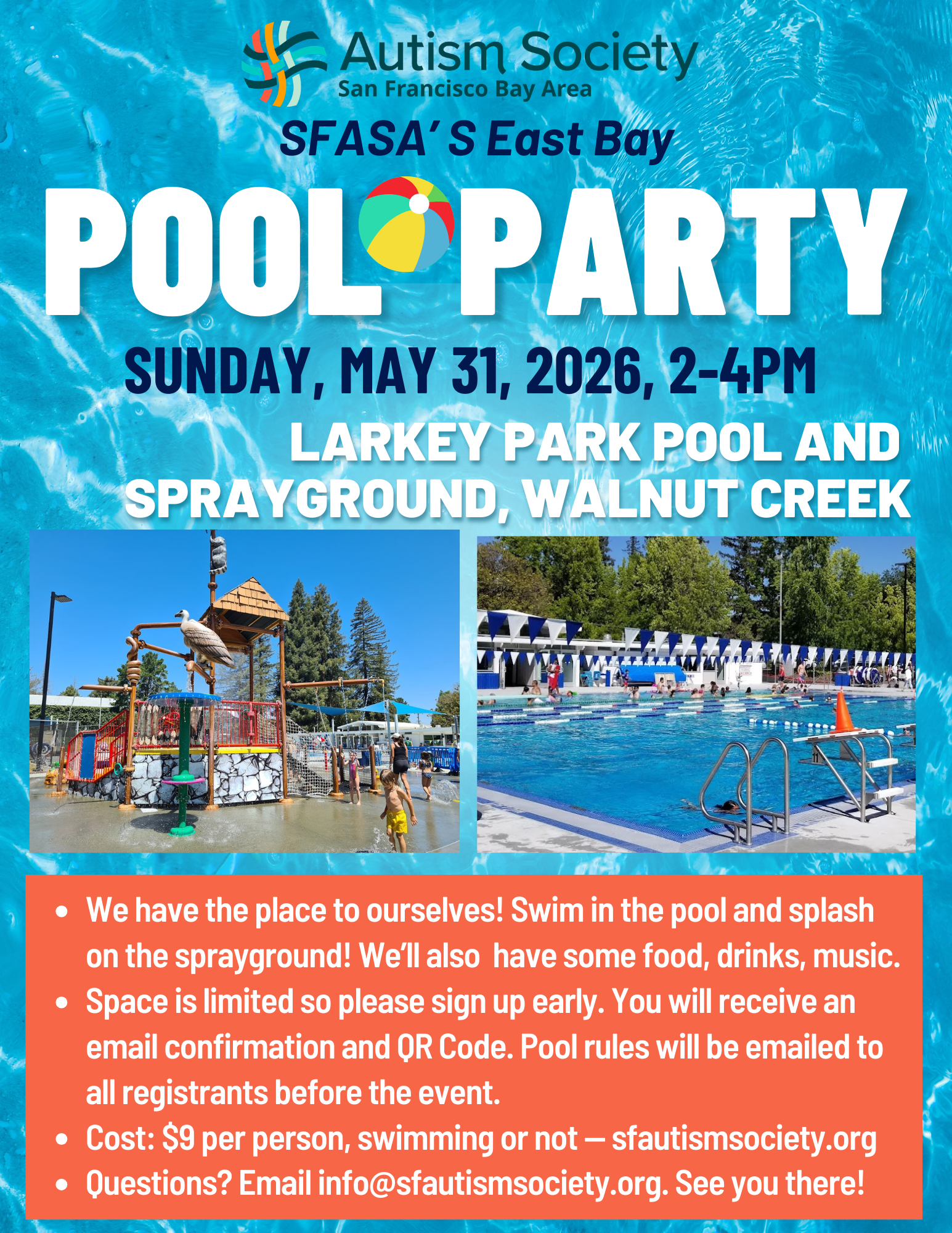 « All Events Pool Party May 31st 2-4PM May 31 @ 2:00 pm - 4:00 pm « SFASA Climbing Party Tennis on Tap » Add to calendar Google Calendar iCalendar Outlook 365 Outlook Live Details Date: May 31 Time: 2:00 pm - 4:00 pm Event Categories: Babies & Young Children, Children, Outdoors, Water Event Tags:SFASA Website: https://sfasa.givecloud.co/product/PP53126/pool-party-may-31st-2-4pm Organizer Autism Society San Francisco Bay Area Phone 650-339-8477 Email info@sfautismsociety.org View Organizer Website Venue Larkey Park Pool and Sprayground, Walnut Creek 2771 Buena Vista Ave Walnut Creek, 94597 United States + Google Map View Venue Website