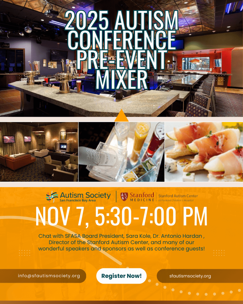 Please join us for a pre-event mixer! Have the opportunity to chat and get to know the amazing Sara Kole, SFASA Board President, the renowned Dr. Antonio Hardan, Director of the Stanford Autism Center, and many of our wondeful sponosrs and speakers.Each guest will receive two drink coupons and we will have light hot and cold appetizers for your enjoyment. We will have a free door prize raffle for all that arrive before 6:45 pm.