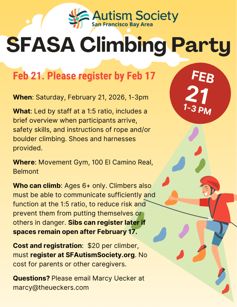 Cost and registration: $20 per climber, must register at SFAutismSociety.org. No cost for parents or other caregivers.