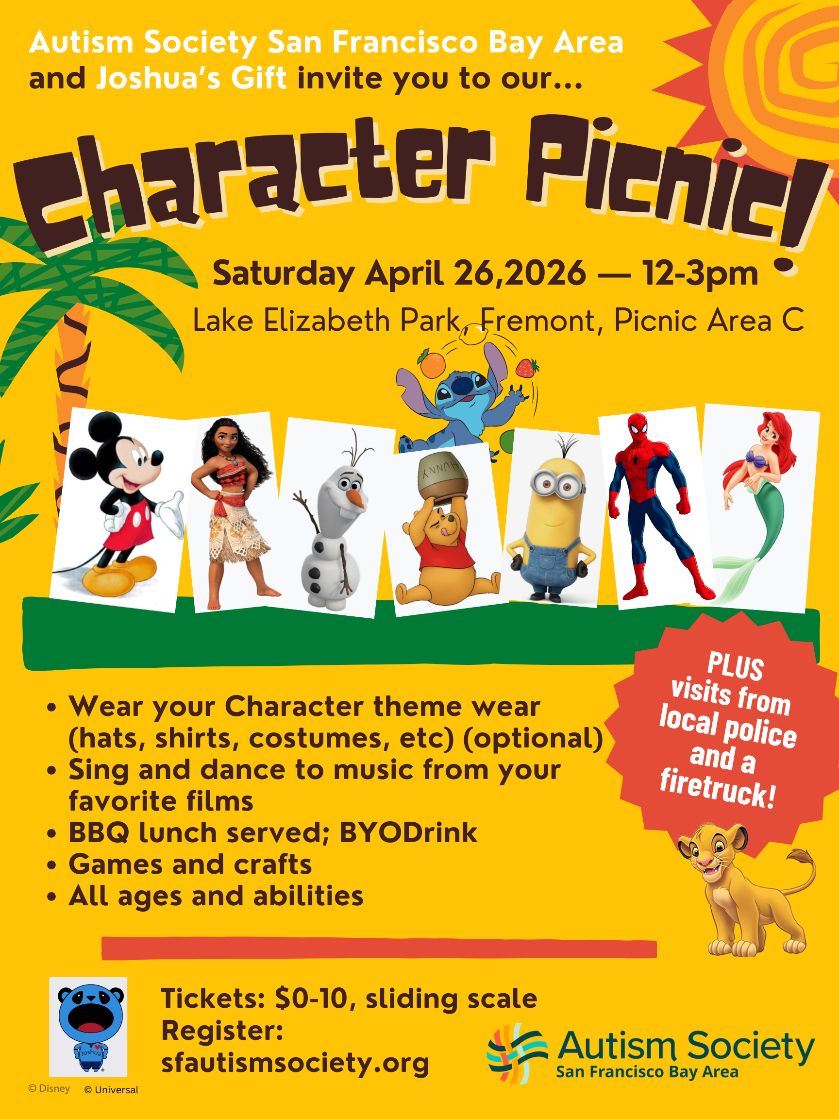 Character Picnic in the Park! Brought to you by SFASA and Joshua’s Gift When: Sunday, April 26, 2026, 12-3pm Deadline to register: April 23, 2026 Where: Lake Elizabeth Park, Picnic...